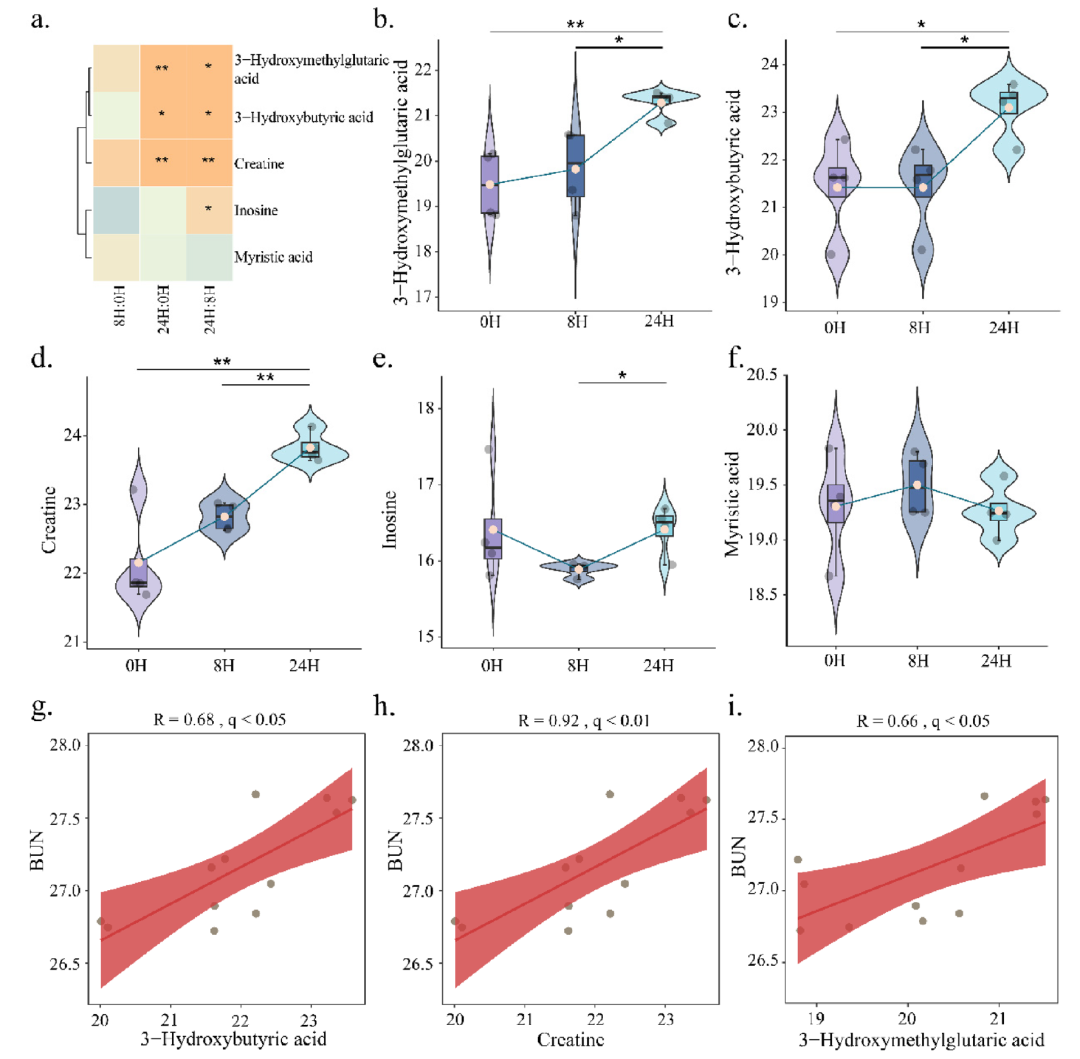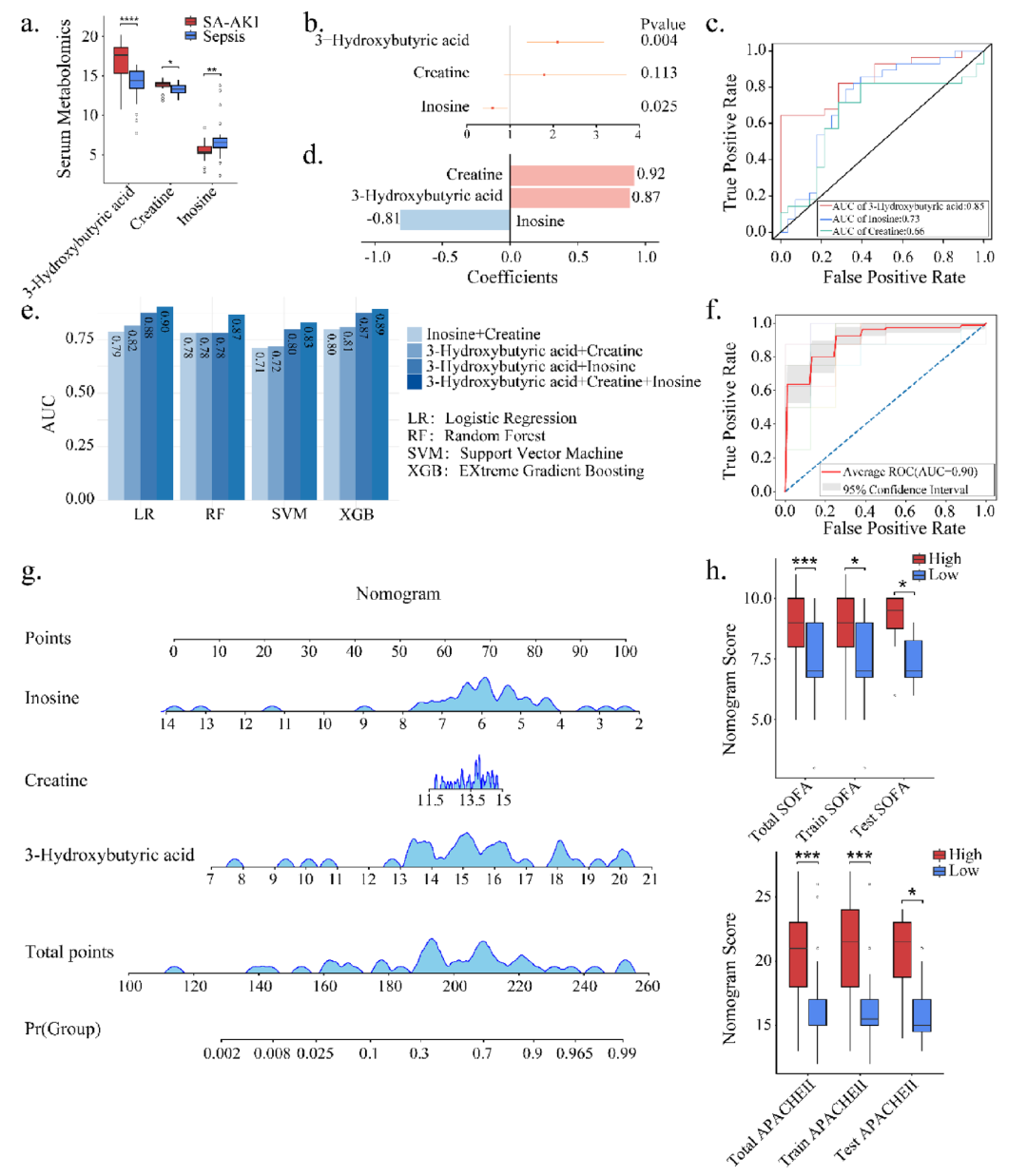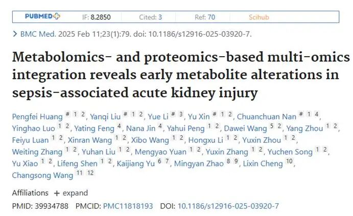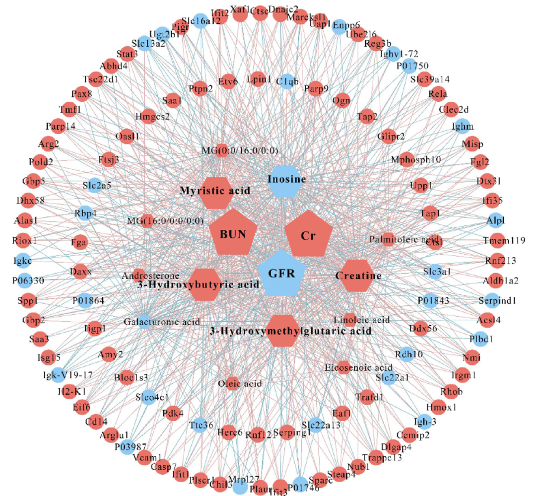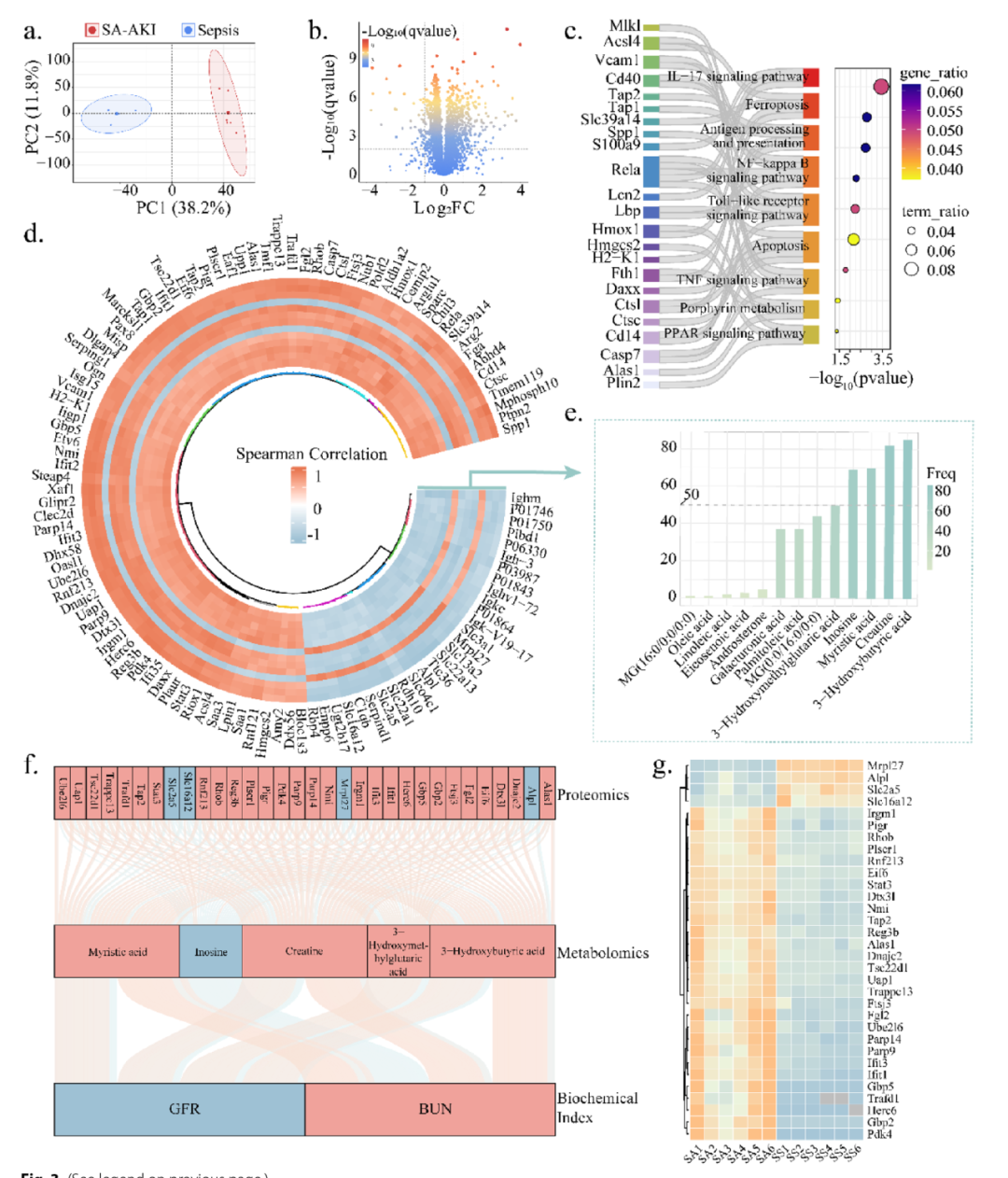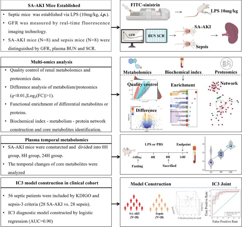 明確科學(xué)問題:切忌盲目追求“大而全”的多組學(xué)。從一個(gè)清晰的科學(xué)假設(shè)出發(fā),選擇最能回答該問題的組學(xué)組合。 精心設(shè)計(jì)實(shí)驗(yàn):良好的實(shí)驗(yàn)設(shè)計(jì)是成功的一半。確保有足夠的生物學(xué)重復(fù),并嚴(yán)格控制實(shí)驗(yàn)條件,以減少不必要的批次效應(yīng)。 尋求合作:多組學(xué)研究通常需要跨學(xué)科合作。主動(dòng)與生物信息學(xué)家、統(tǒng)計(jì)學(xué)家以及其他領(lǐng)域的專家合作,能極大提高研究效率和深度。 利用公共資源:善于學(xué)習(xí)利用已有的公共數(shù)據(jù)庫(kù)(如TCGA、GEO、MetaboLights等)進(jìn)行數(shù)據(jù)挖掘和驗(yàn)證,可以補(bǔ)充自己的研究,甚至獲得新的發(fā)現(xiàn)。 關(guān)注技術(shù)發(fā)展:多組學(xué)領(lǐng)域發(fā)展迅速,新的實(shí)驗(yàn)技術(shù)和計(jì)算方法不斷涌現(xiàn)。保持關(guān)注和學(xué)習(xí),將最新的工具應(yīng)用于你的研究。 重中之重!多看文獻(xiàn)案例:多組學(xué)聯(lián)合分析讓我們能更全面、系統(tǒng)地認(rèn)識(shí)生物過程的復(fù)雜性。對(duì)于多組學(xué)研究來(lái)說(shuō),除了了解聯(lián)合分析相關(guān)行業(yè)動(dòng)態(tài),其中的課題設(shè)計(jì)、實(shí)驗(yàn)執(zhí)行、數(shù)據(jù)分析和論文撰都可以在前人文章中學(xué)習(xí)。 熱 門 案 例 基于代謝組學(xué)和蛋白質(zhì)組學(xué)的多組學(xué)整合揭示膿毒癥相關(guān)急性腎損傷的早期代謝物變化 研究背景: 膿毒癥相關(guān)急性腎損傷(SA-AKI)是膿毒癥患者常見的并發(fā)癥,死亡率高達(dá) 41%。因此,早期識(shí)別SA-AKI對(duì)于實(shí)施支持性治療和預(yù)防進(jìn)一步損害至關(guān)重要。研究旨在識(shí)別和驗(yàn)證SA-AKI的代謝物生物標(biāo)志物,以輔助早期臨床診斷。 實(shí)驗(yàn)方法: ①動(dòng)物實(shí)驗(yàn):將 28 只雄性 C57BL/6 小鼠分為兩組,一組注射脂多糖(LPS,10mg/kg,i.p.)構(gòu)建膿毒癥小鼠模型,通過測(cè)量腎小球?yàn)V過率(GFR)、血尿素氮(BUN)和肌酐水平區(qū)分膿毒癥和 SA-AKI 小鼠;另一組小鼠注射 LPS 后,在 0h、8h、24h 三個(gè)時(shí)間點(diǎn)處死,獲取血清樣本 。 ②臨床研究:回顧性納入哈爾濱醫(yī)科大學(xué)附屬第二醫(yī)院重癥醫(yī)學(xué)科 56 例患者(28 例 SA-AKI 患者和 28 例膿毒癥患者),收集外周靜脈血樣本。 ③組學(xué)分析:對(duì)小鼠腎組織進(jìn)行非靶向代謝組學(xué)和蛋白質(zhì)組學(xué)分析;對(duì)小鼠血清進(jìn)行代謝組學(xué)分析;對(duì)臨床患者血清進(jìn)行靶向定量代謝組學(xué)分析。 ④數(shù)據(jù)分析:差異分析篩選差異代謝物和蛋白質(zhì);Spearman 相關(guān)性分析構(gòu)建多組學(xué)網(wǎng)絡(luò);使用多種機(jī)器學(xué)習(xí)算法構(gòu)建診斷模型,通過受試者工作特征曲線(ROC)評(píng)估模型性能。 研究結(jié)果: 代謝組學(xué)變化:SA-AKI 小鼠與膿毒癥小鼠相比,血漿 BUN 和肌酐顯著升高,GFR 顯著降低。鑒定出 13 種差異腎代謝物,主要參與不飽和脂肪酸生物合成、亞油酸代謝等途徑。 蛋白質(zhì)組學(xué)與多組學(xué)網(wǎng)絡(luò):發(fā)現(xiàn) 112 種與腎功能相關(guān)的差異腎蛋白質(zhì),主要參與炎癥和細(xì)胞死亡相關(guān)通路。確定 5 種核心代謝物(3 - 羥基丁酸、3 - 羥甲基戊二酸、肌酸、肉豆蔻酸、肌苷),構(gòu)建多組學(xué)網(wǎng)絡(luò)揭示它們與蛋白質(zhì)和腎功能指標(biāo)的關(guān)聯(lián)。 核心代謝物時(shí)間序列變化:SA-AKI 小鼠血清中,3 - 羥甲基戊二酸、3 - 羥基丁酸和肌酸在 0-24h 顯著增加,肉豆蔻酸在 8h 增加,肌苷在 8h 下降。3 - 羥基丁酸、肌酸和 3 - 羥甲基戊二酸與 BUN 呈正相關(guān)。 IC3 模型構(gòu)建:臨床研究驗(yàn)證了 3 種核心代謝物(肌苷、肌酸、3 - 羥基丁酸)在 SA-AKI 患者和膿毒癥患者中的差異。IC3 模型(基于這 3 種代謝物的邏輯回歸模型)診斷 SA-AKI 的 AUC 為 0.90,且模型評(píng)分與 SOFA、APACHE II 評(píng)分(疾病嚴(yán)重程度指標(biāo))正相關(guān),高評(píng)分組患者疾病更重。 小結(jié): 通過多組學(xué)整合分析,確定了 5 種與 SA-AKI 相關(guān)的核心代謝物,并構(gòu)建了基于其中 3 種代謝物的 IC3 診斷模型,可有效早期識(shí)別 SA-AKI。但研究存在臨床樣本量小、單中心招募、未考慮潛在混雜因素、僅用雄性小鼠實(shí)驗(yàn)等局限性,未來(lái)需擴(kuò)大樣本量、開展多中心研究驗(yàn)證模型準(zhǔn)確性和可靠性。